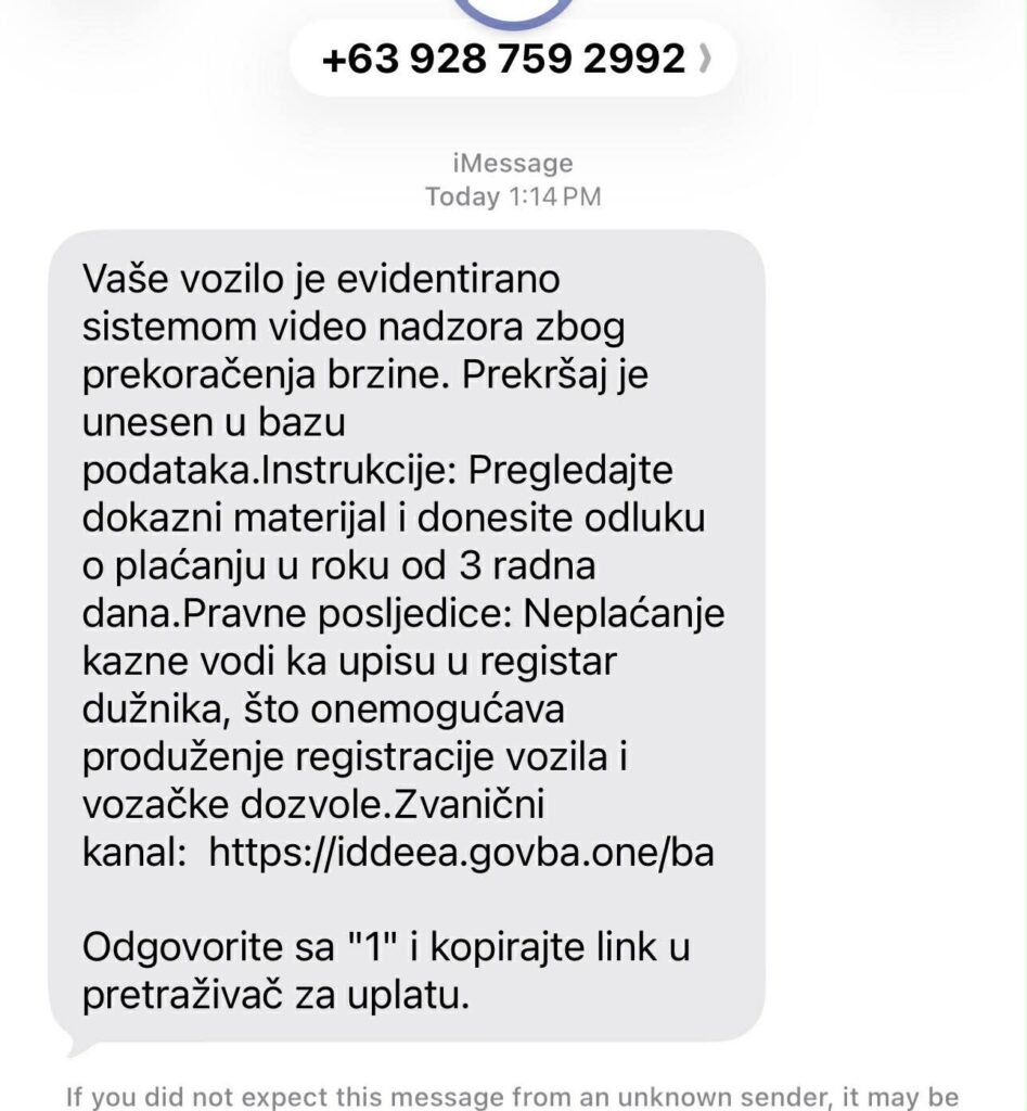 Građanima se šalju poruke u kojima se lažno navodi postojanje saobraćajnih kazni, hitnih rokova za plaćanje, pravnih posljedica i navodnih registara dužnika, uz dostavljanje sumnjivih internet linkova koji nemaju nikakve veze sa zvaničnim sistemima institucija Bosne i Hercegovine.